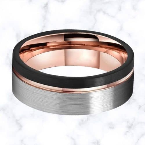 L’anello Erudite è elegante e sofisticato. Questo splendido anello da uomo in carburo di tungsteno presenta un lato spazzolato in argento, un lato spazzolato in nero e una scanalatura in oro rosa altamente lucidata tra di loro. L’interno dell’anello è in oro rosa che si intravede appena sui bordi dell’anello. Questa combinazione di toni diversi aggiunge un bel contrasto al design dell’anello.