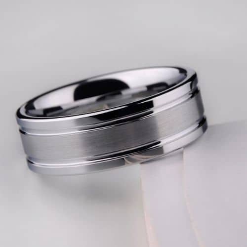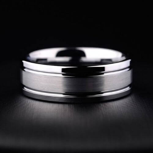 Attraente all’estremo. Un design semplice ma sofisticato in tungsteno. Mondiale ha un centro in argento spazzolato e due scanalature lucide su entrambi i lati.